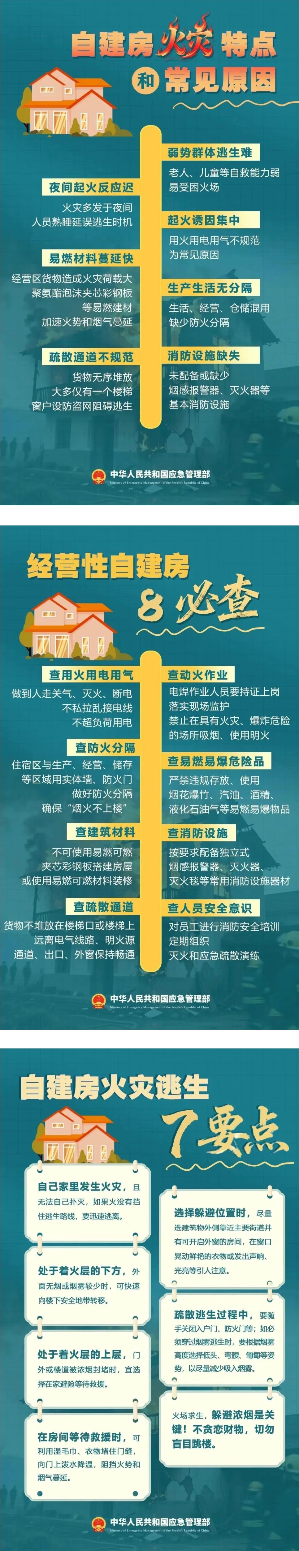 自建房历来是防火的重点场所,不少自建房“下店上宅、前店后宅”,经营、居住、仓储功能混合,存在消防基础设施较差,防火设计不足等问题,一旦发生火灾,极易造成人员伤亡。自建房有哪些常见消防隐患?如何预防火灾事故发生?遭遇火灾如何正确逃生?这些安全要点一定要牢记。