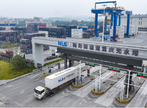 12月8日,位于重庆沙坪坝区的陆海新通道重庆无水港内,来自全球的集装箱正在装车。