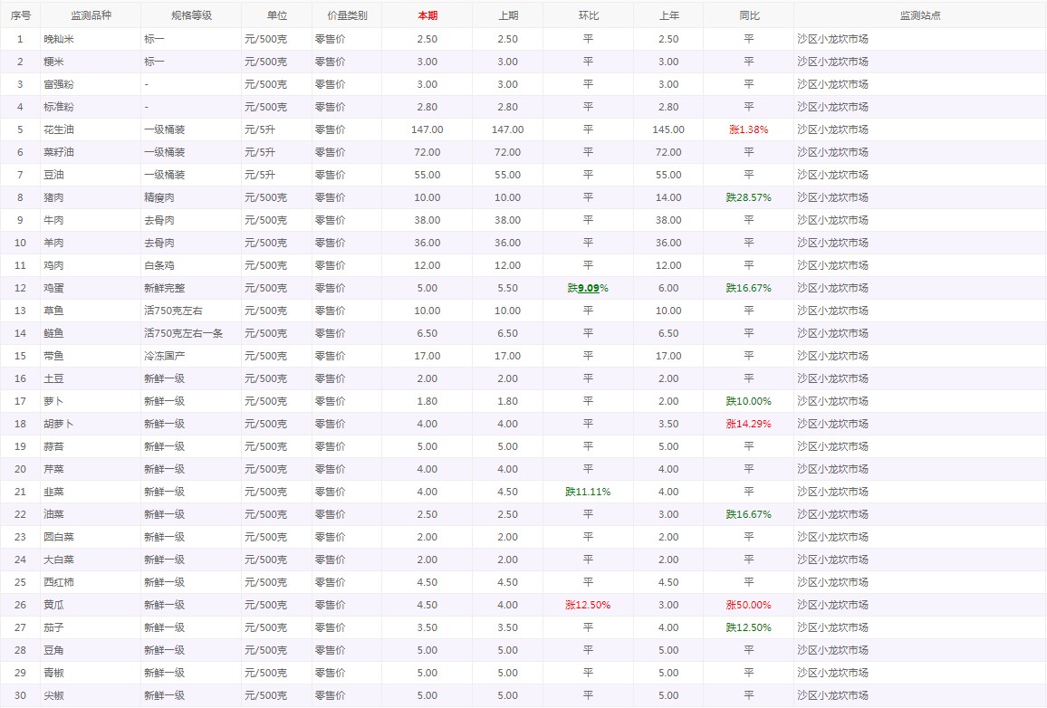 粮油内禽蛋菜水产品等价格应急监测情况(小龙坎农贸市场)采价日期(2025年10月30日)