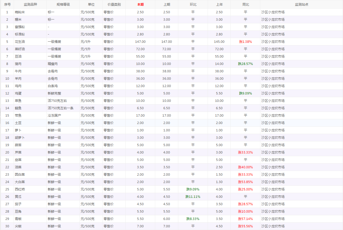 粮油内禽蛋菜水产品等价格应急监测情况(小龙坎农贸市场)采价日期(2026年1月26日)