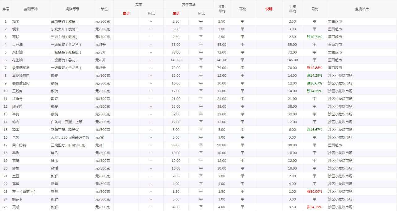 粮油内禽蛋菜水产品等价格应急监测情况(重百超市、小龙坎农贸市场)采价日期(2026年2月25日)