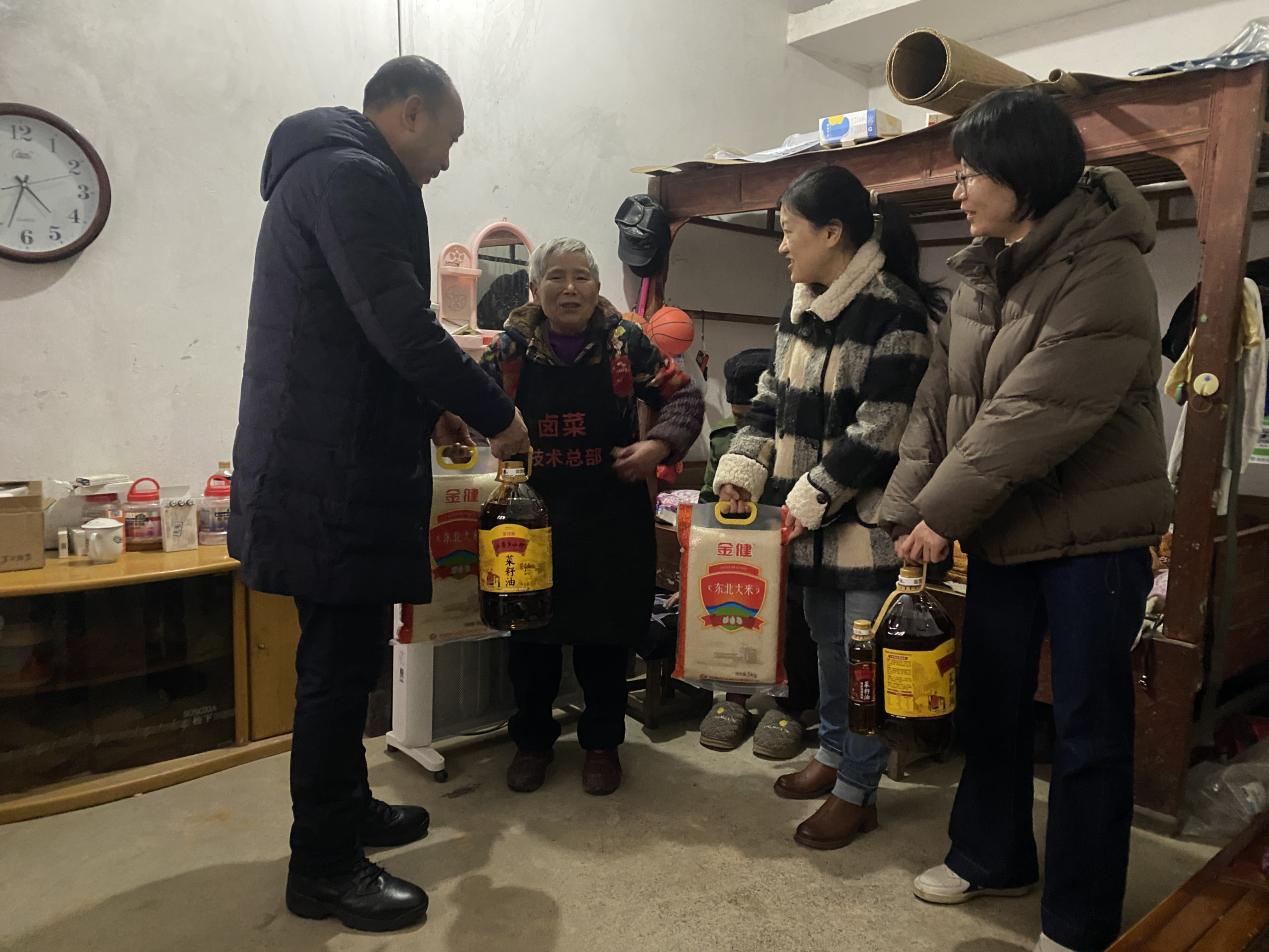 慰问过程中,牟书记一行人为困难群众家庭送去米、油等慰问品,了解困难群众的家庭生活情况及身体健康状况,同时叮嘱他们冬季居家消防注意事项。大鹿池社陈婆婆拉着牟书记的手感激地说:“感谢你们的关心,要过年了,还特意为我们送来慰问品。”