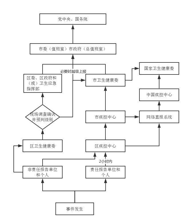 ②区疾病预防控制中心应在接到突发公共卫生事件信息报告的2小时内向区卫生健康委报告,并进行国家突发公共卫生事件网络直报;区卫生健康委接到报告后2小时内向区政府和市卫生健康委报告,并立即进行现场调查确认,随时报告应急处置进展情况。