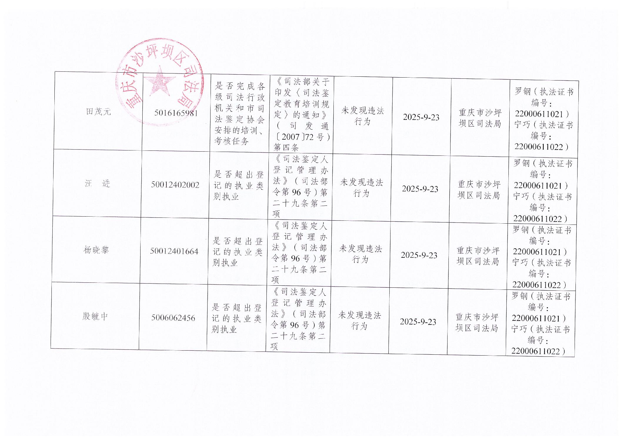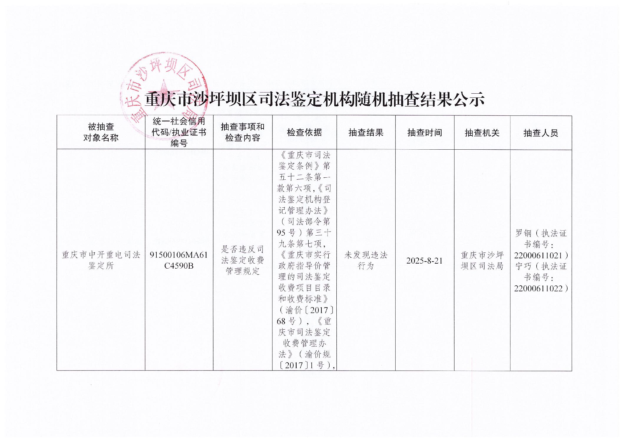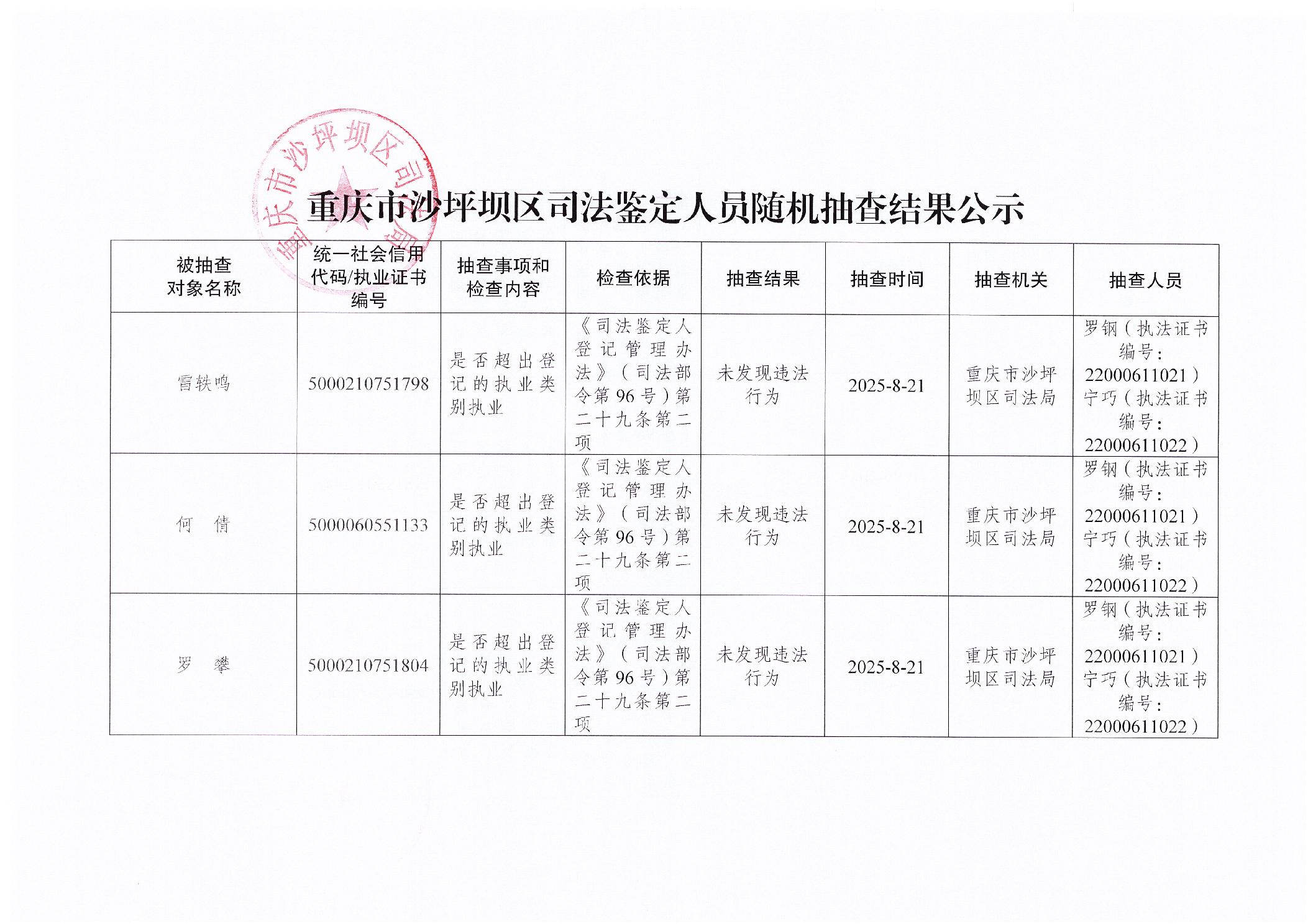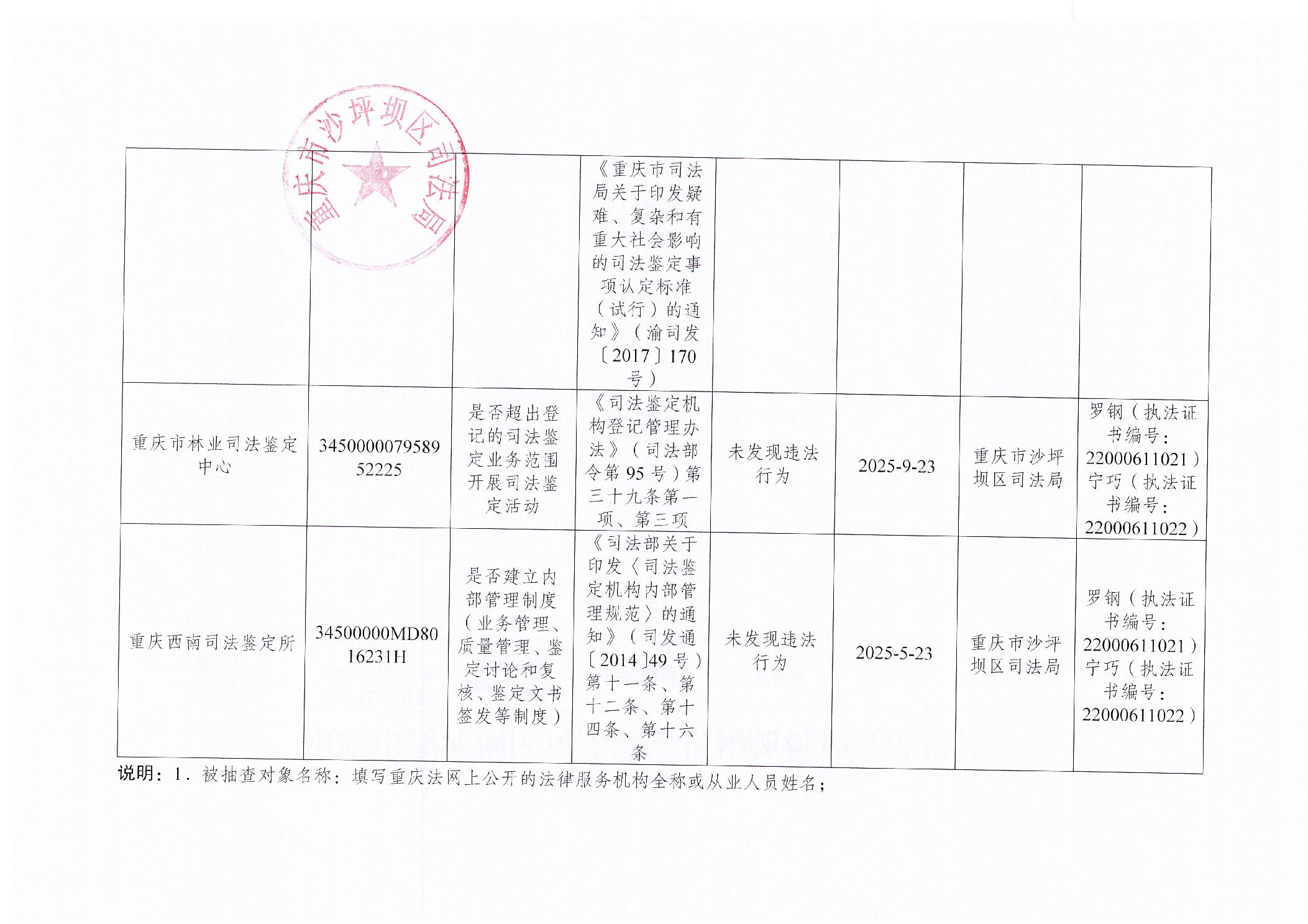 重庆市沙坪坝区司法局开展2025年度“双随机、一公开”检查工作结果公示(鉴定机构、鉴定员)